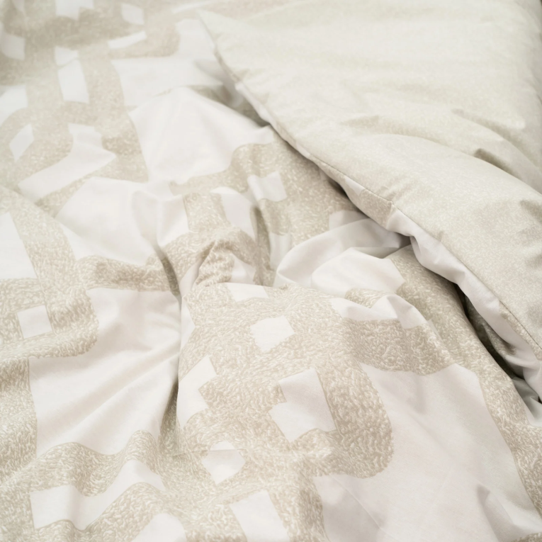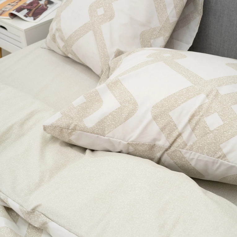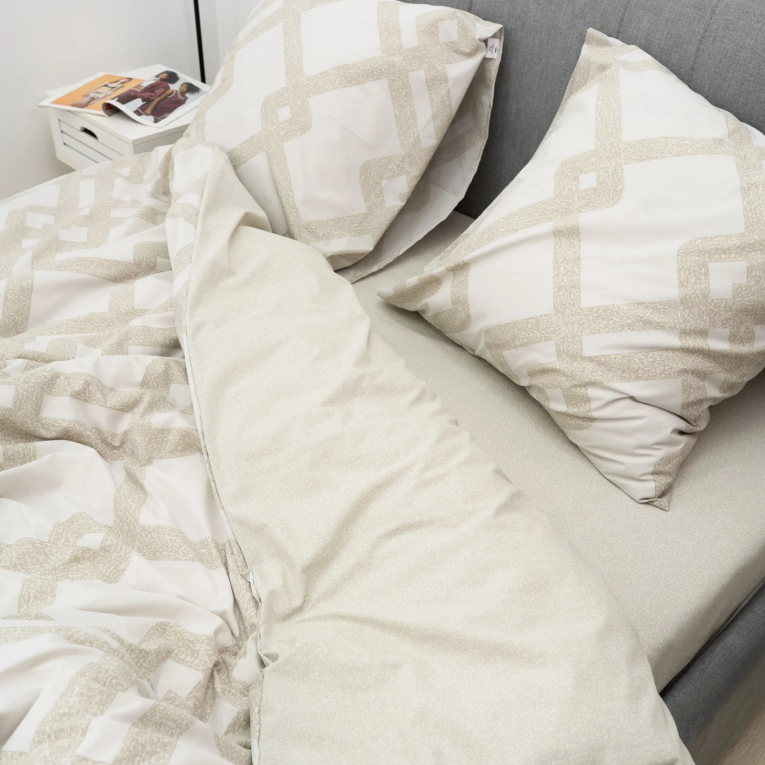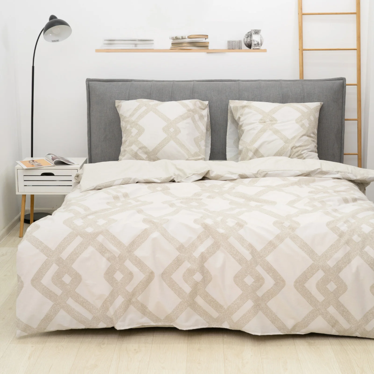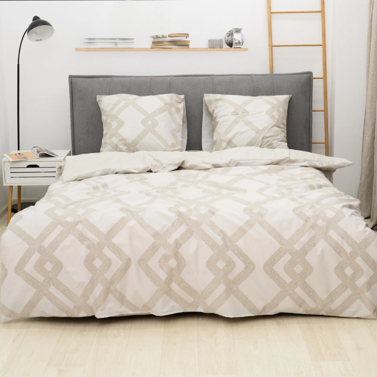 Ткань ранфорс плотная, приятная на ощупь и производят ее из 100% хлопковой крученной нити. Натуральность материала дает возможность дышать телу во время сна. Выбирая двуспальный комплект 25356 Вилюта, с интересным принтом, вы получаете также и эстетическое наслаждение.