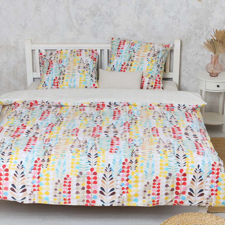 Ткань ранфорс плотная, приятная на ощупь и производиться из 100% хлопковой крученной нити. Натуральность материала дает возможность дышать телу во время сна. А выбирая комплект 22197 Вилюта двуспальное с оригинальным принтом, вы получаете также и эстетическое наслаждение.