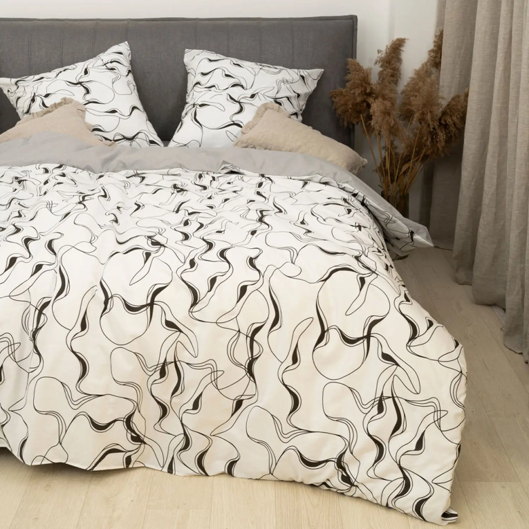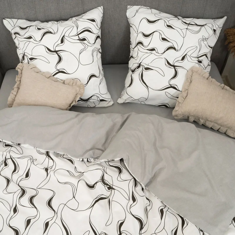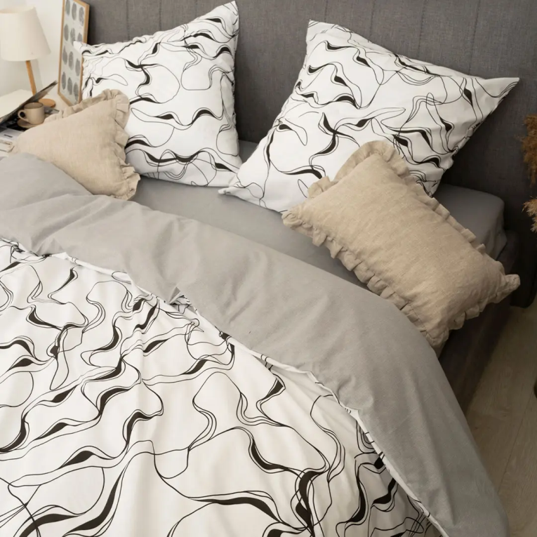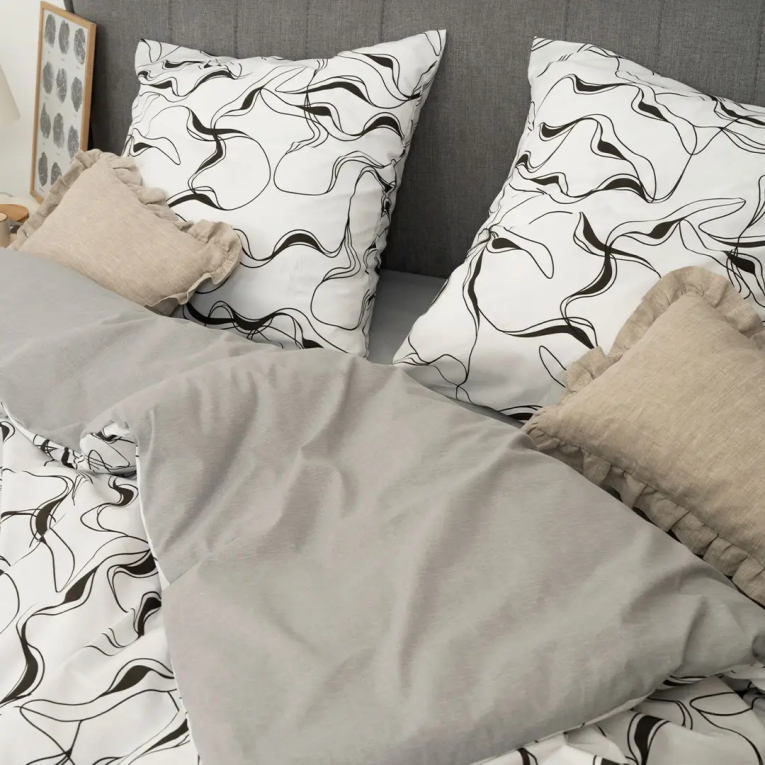 Ткань ранфорс плотная, приятная на ощупь и производят ее из 100% хлопковой крученной нити. Натуральность материала дает возможность дышать телу во время сна. А выбирая комплект Вилюта 24290, с интересным принтом на светлом фоне, вы привнесете свежесть в интерьер.