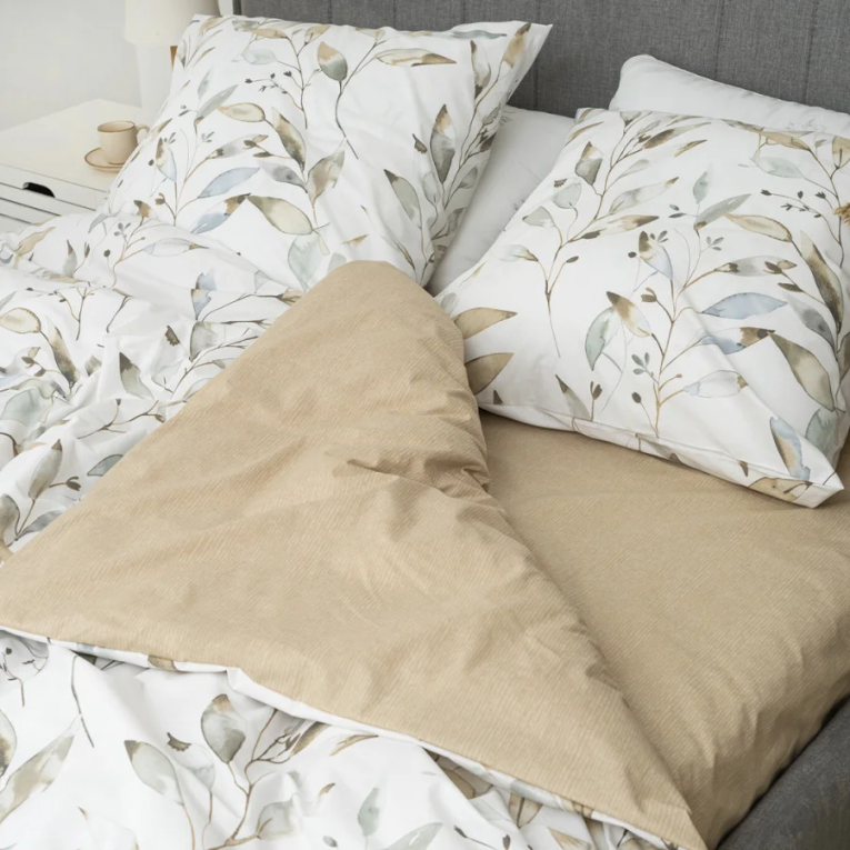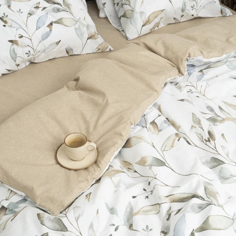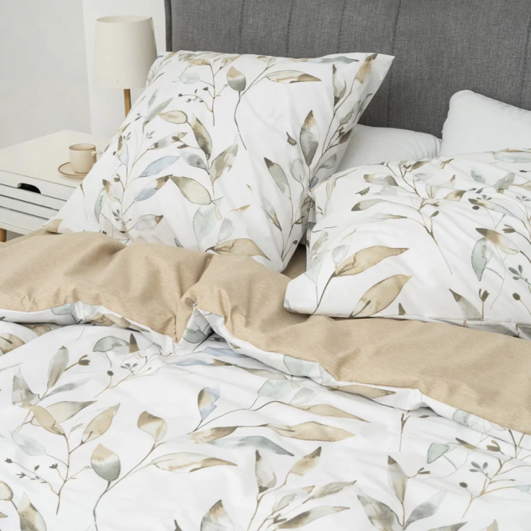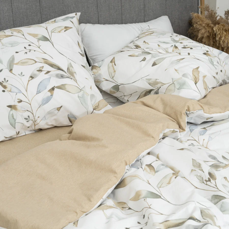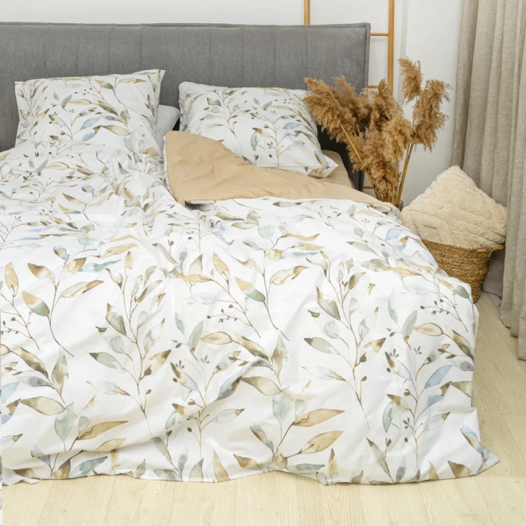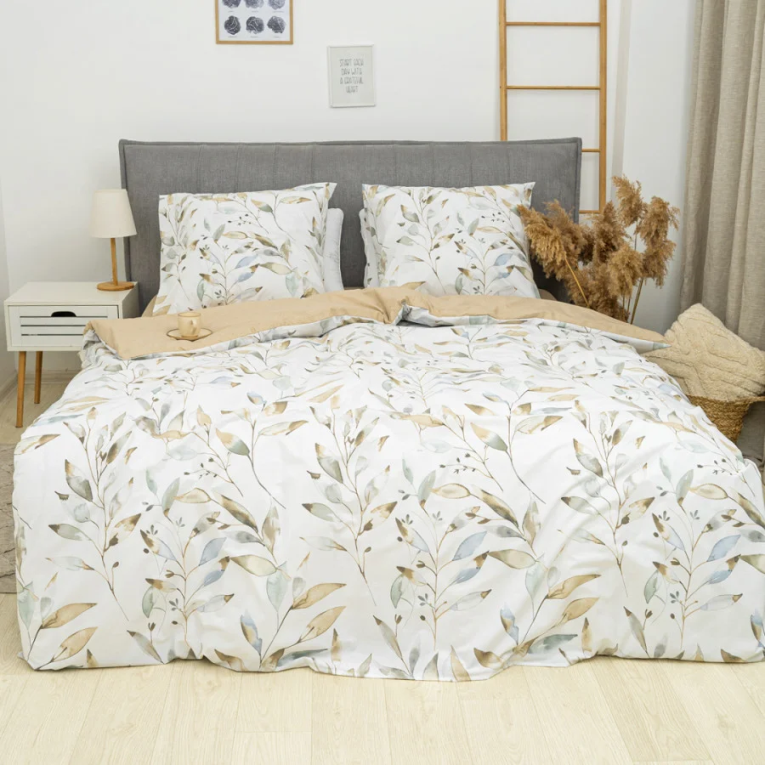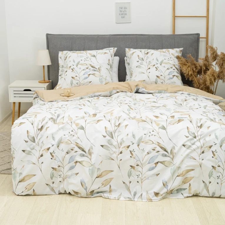 Ткань ранфорс плотная, приятная на ощупь и производят ее из 100% хлопковой крученной нити. Натуральность материала дает возможность дышать телу во время сна. А выбирая комплект Вилюта 24328, с интересным принтом на светлом фоне, вы привнесете свежесть в интерьер.